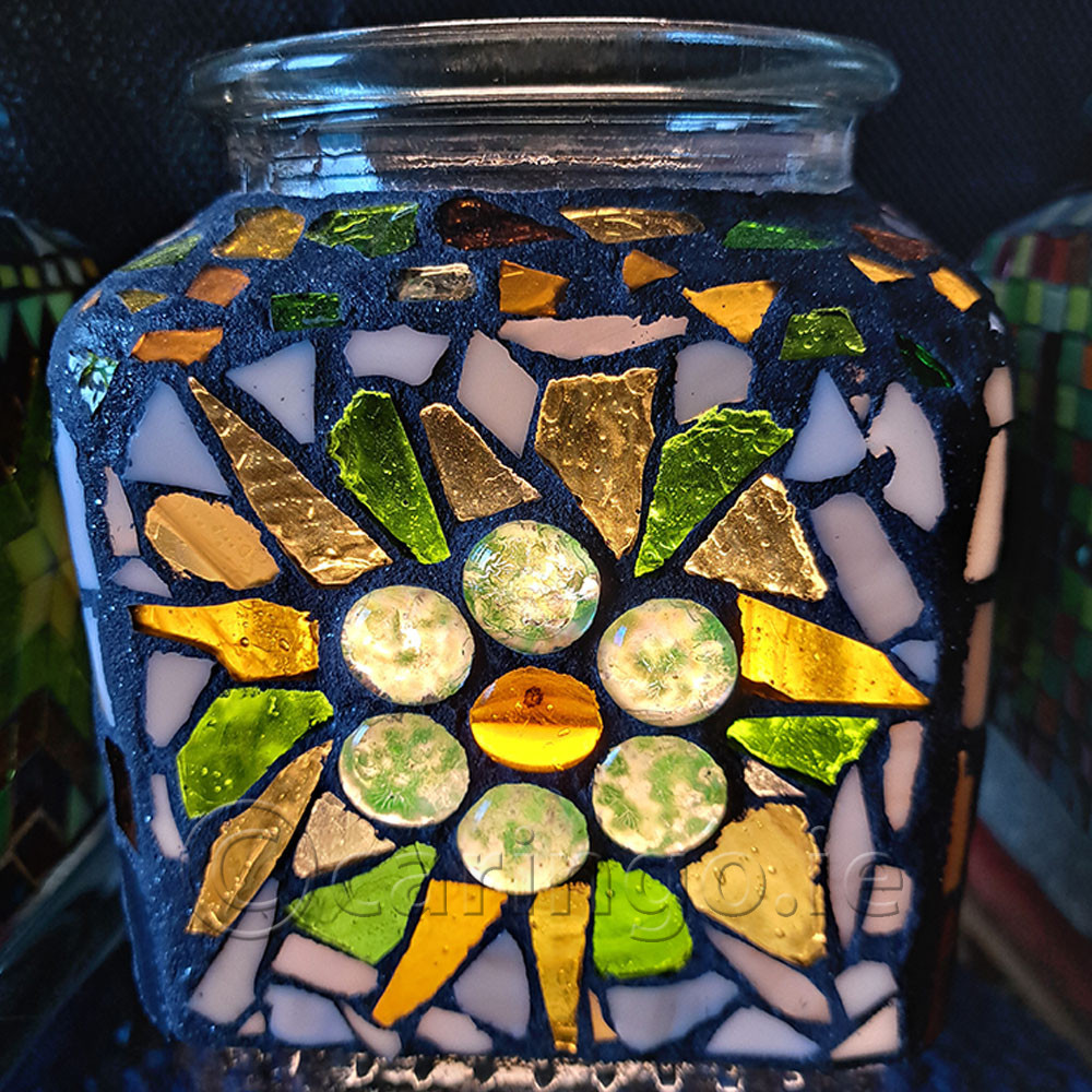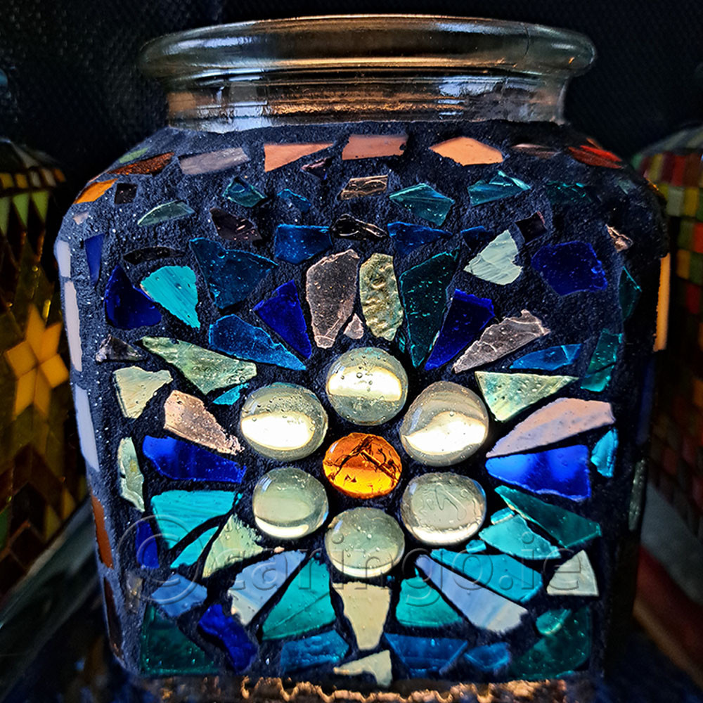 Glass mosaic jar with glass pebbles, glass mosaic pieces, black grouting, cork lid. 13×13 cm 5″x 5″nch